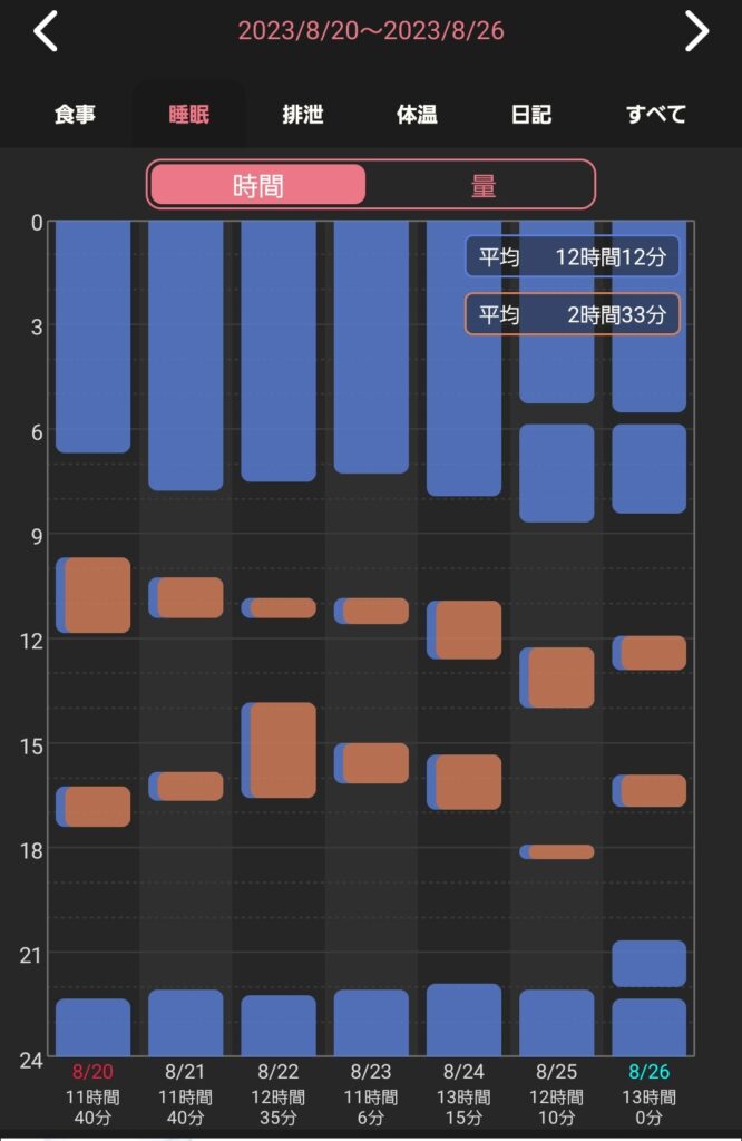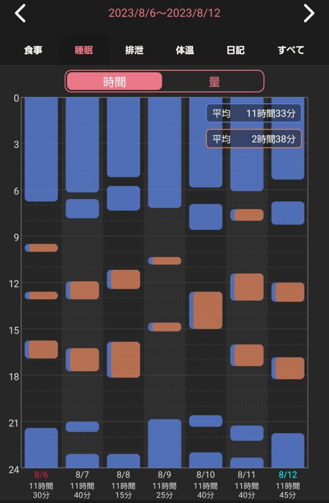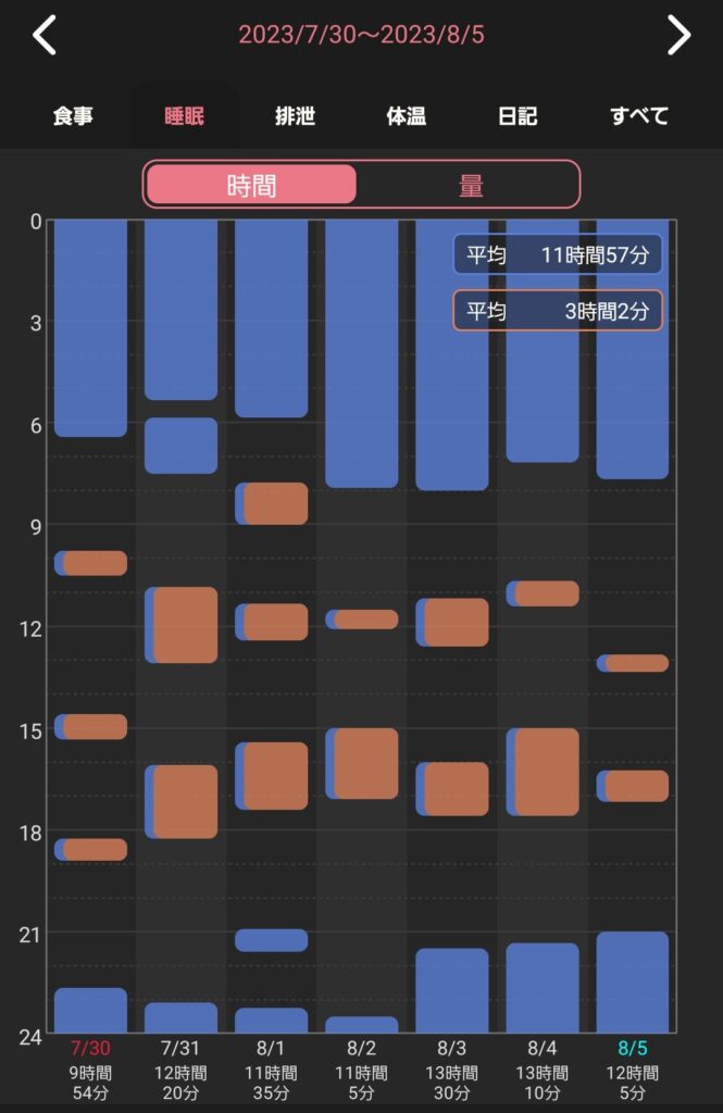 朝寝、昼寝の平均値はおおよそ2時間半になっているものの、めちゃくちゃ波打っていますね。