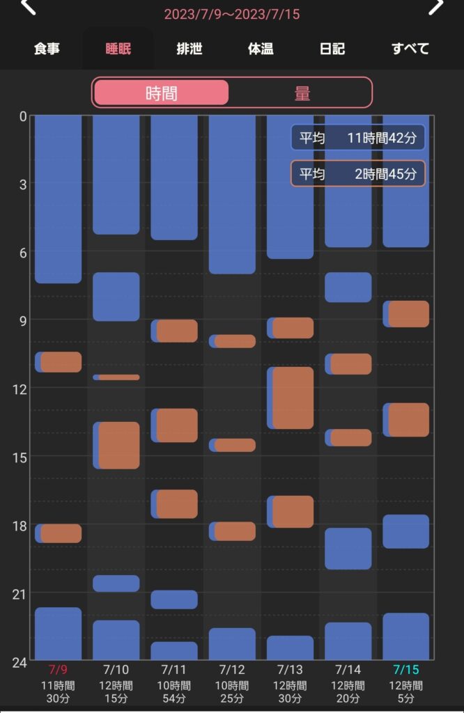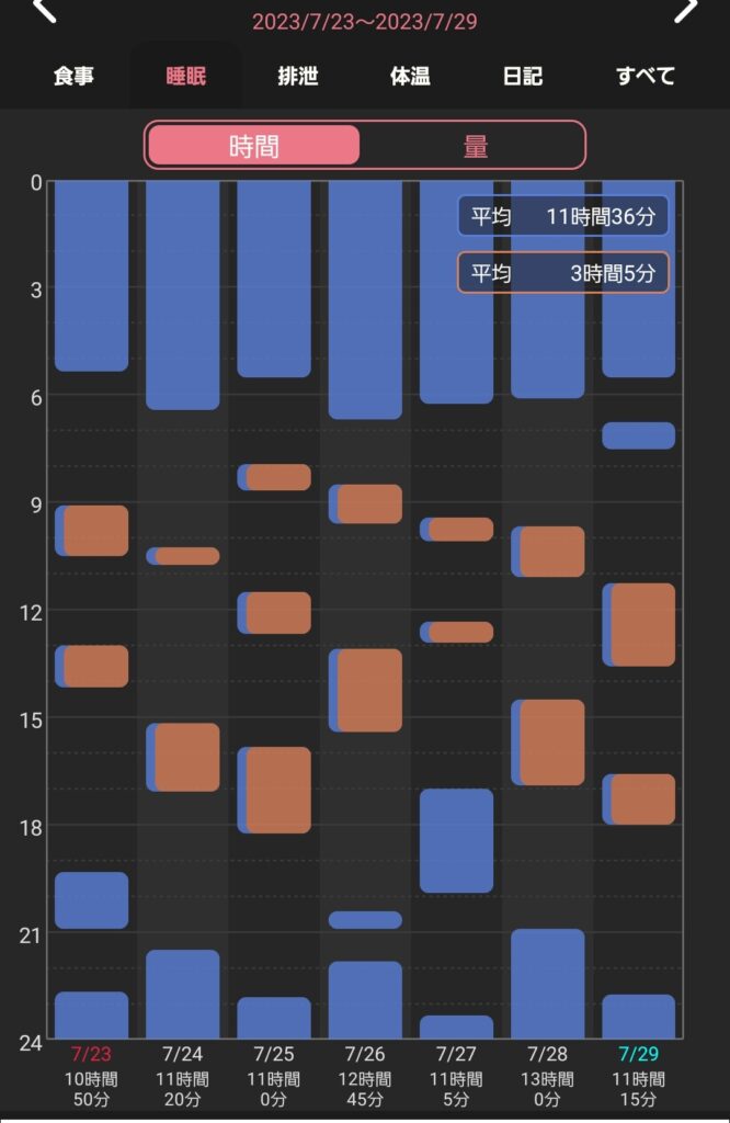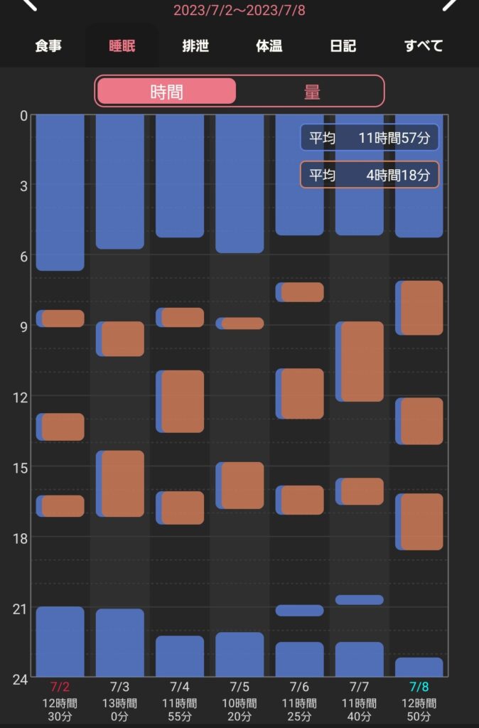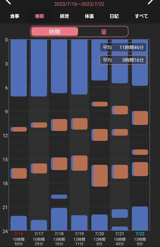さて、スクショをみてもらえばすぐにわかる通り、お昼寝はもちろん、寝る時間も起きる時間も定まっていません。